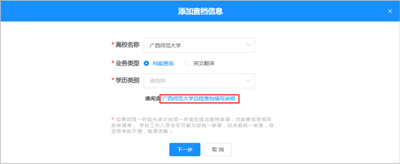 高校名称处选择或输入“广西师范大学”,按个人情况选择“学历类别”。请认真阅读《广西师范大学远程查档填写说明》后,根据个人情况真实、准确填写“申请单”。