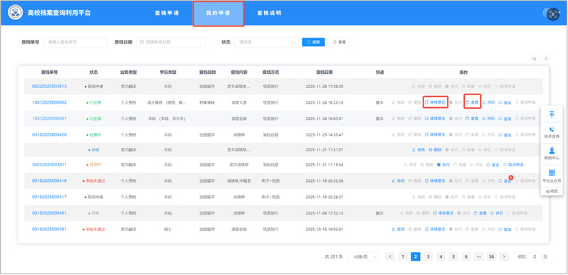 申请结果可在“我的申请”中,点击“查档单号”或“审核意见”进行查看。审核是否通过都会收到短信提醒。申请如被驳回,可以修改并重新提交。