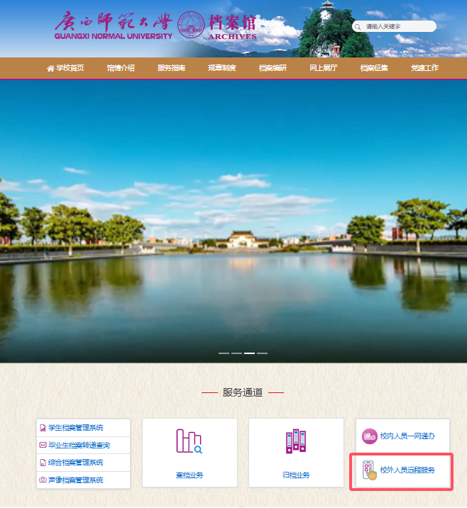 PC端登录“广西师范大学档案馆”(http://dag.gxnu.edu.cn/main.htm),点击“校外人员远程服务” ,即可进入“高校档案查询利用平台”申请查档。