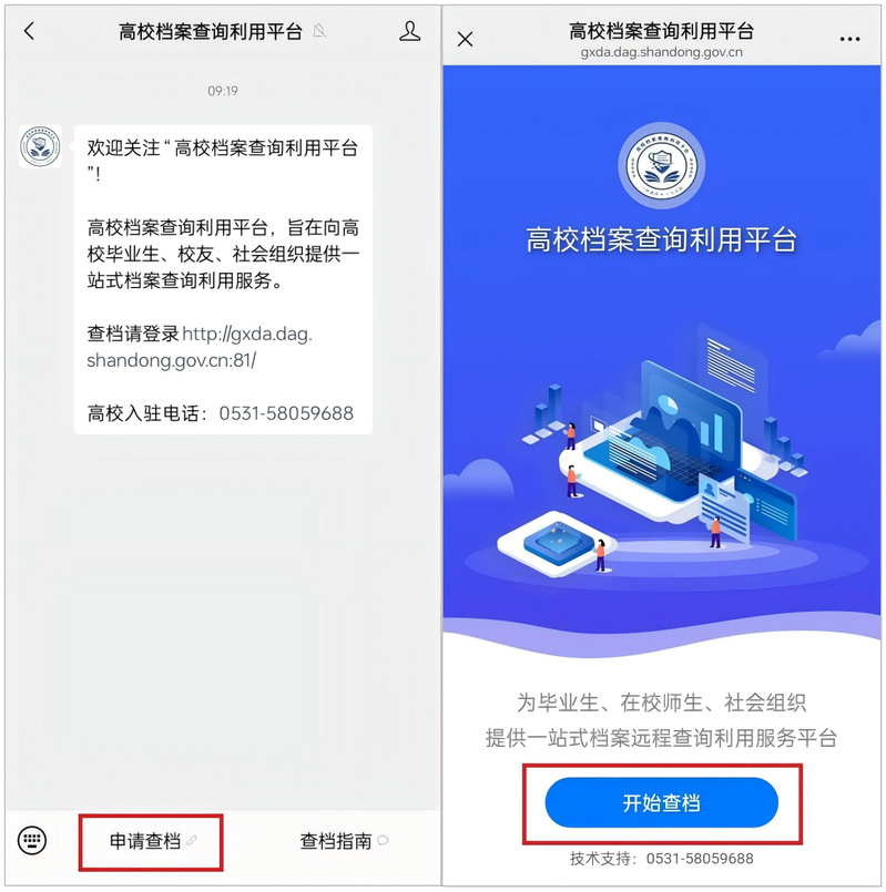手机端使用微信搜索公众号“高校档案查询利用平台”,在菜单栏点击【申请查档】,进入“高校档案查询利用平台”页面,点击【开始查档】,即可申请查档。