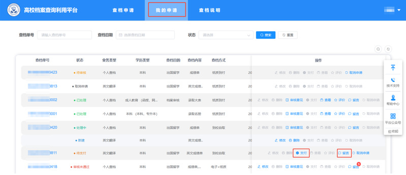在“我的申请”中,点击“支付”,根据系统回复,微信扫码支付,缴费后请点击“留言”将缴费截图上传至平台,待老师确认收到后,即可等待查收档案。